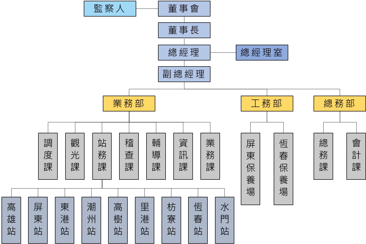 本公司管理部門設置業務、工務、總務三部,以下分9課辦理各項行政業務,營運區域設置車站9處,兼轄保養場2處,